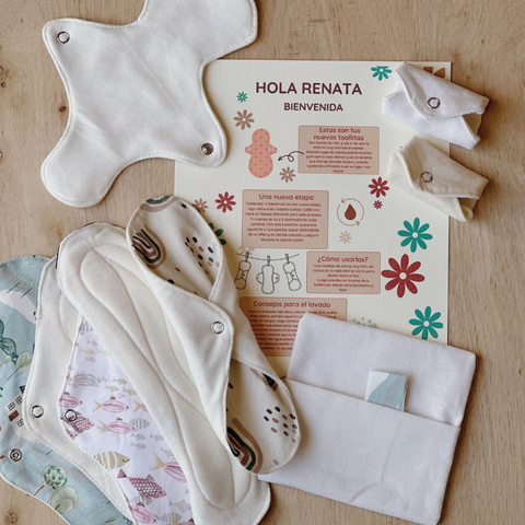 Con un set completo de toallitas de 4 tamaños para las diferentes etapas del ciclo, un sobre de tela para transportarlas en forma segura y discreta y un pequeño manual personalizado con toda la información necesaria para que aprendan a usar y lavar sus toallitas de tela y algunos consejos para transitar estos días.